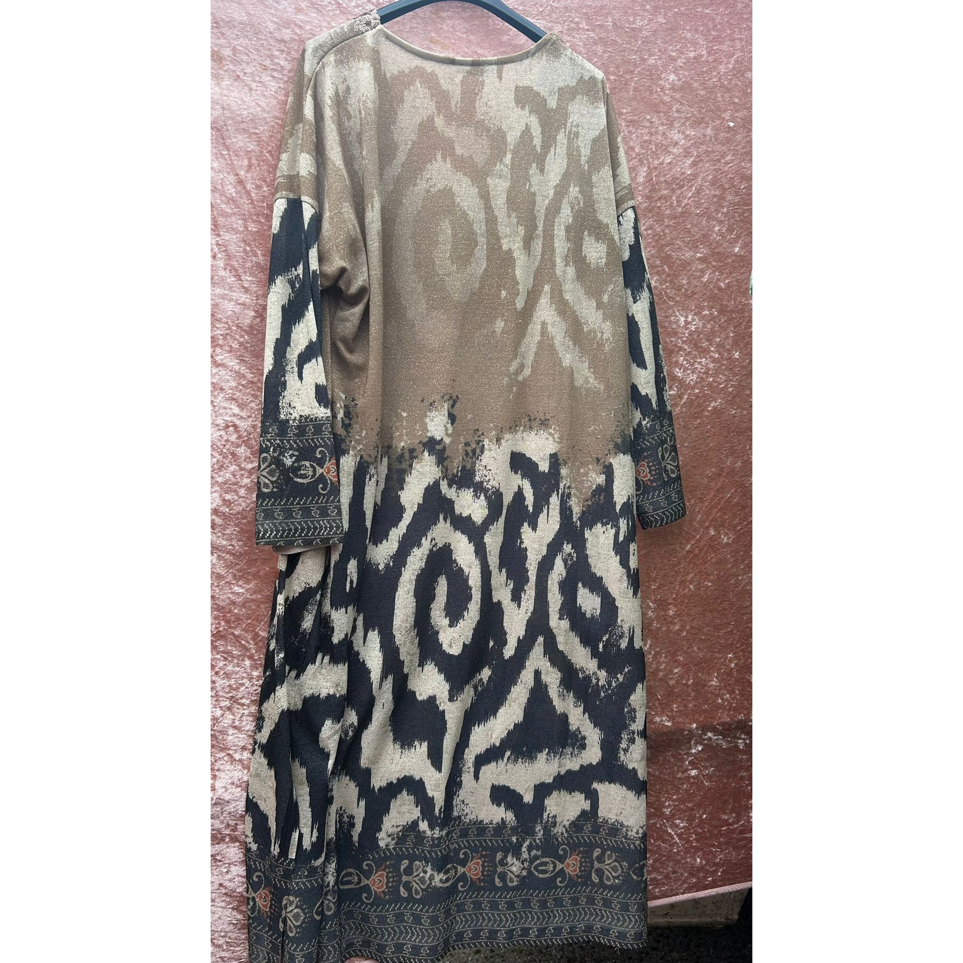 This stunning midi-to-maxi dress features a striking portrait of Frida Kahlo surrounded by rich, warm-toned florals, set against an abstract ikat-inspired print. Designed in a relaxed one-size fit (up to size 18), it drapes beautifully for effortless everyday wear.