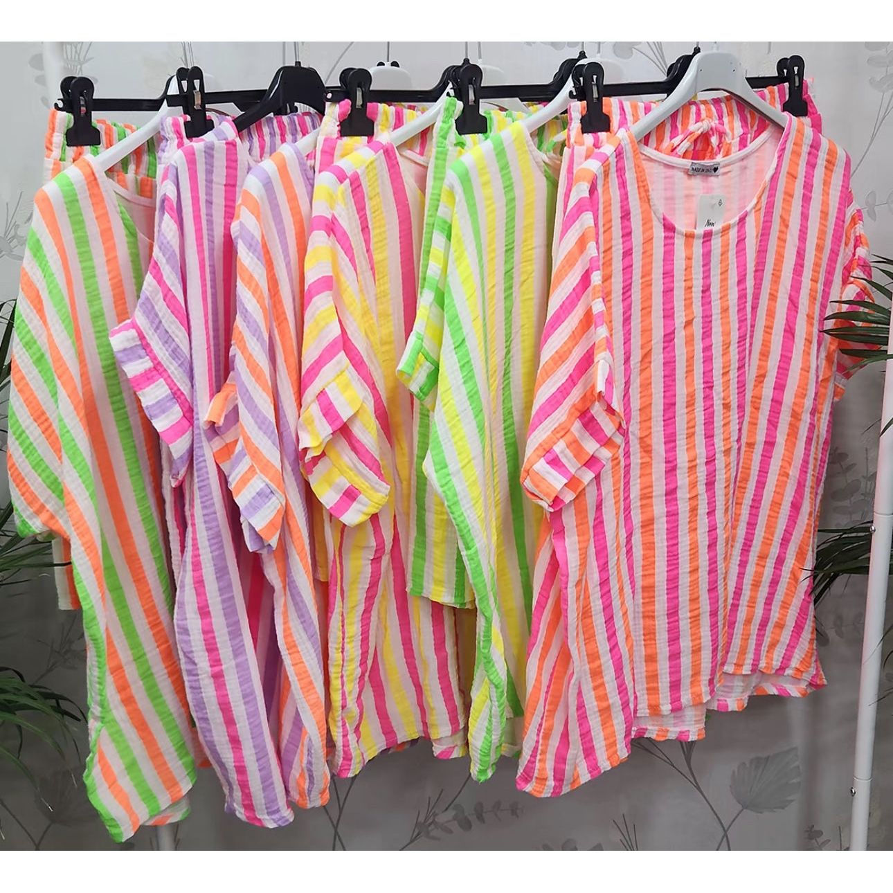 Bring the summer vibes with our Candy Lane Short Set – the ultimate in fun, feel-good fashion! ☀️🍬 Made from soft and breathable cheesecloth fabric, this colourful set features a relaxed round-neck top and matching drawstring shorts in bold neon stripes.