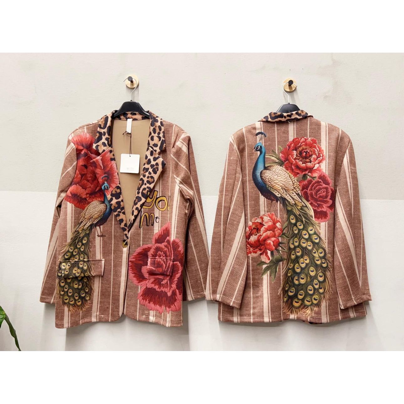 Bring a touch of elegance and drama to your wardrobe with our Regal Peacock Suedette Blazer. Crafted from soft suedette fabric, this show-stopping piece features a rich stripe base in warm earthy tones, adorned with stunning peacock artwork and bold red peonies on both the front and back. The leopard-print lapel adds a playful twist, making this blazer a true blend of luxury and personality.