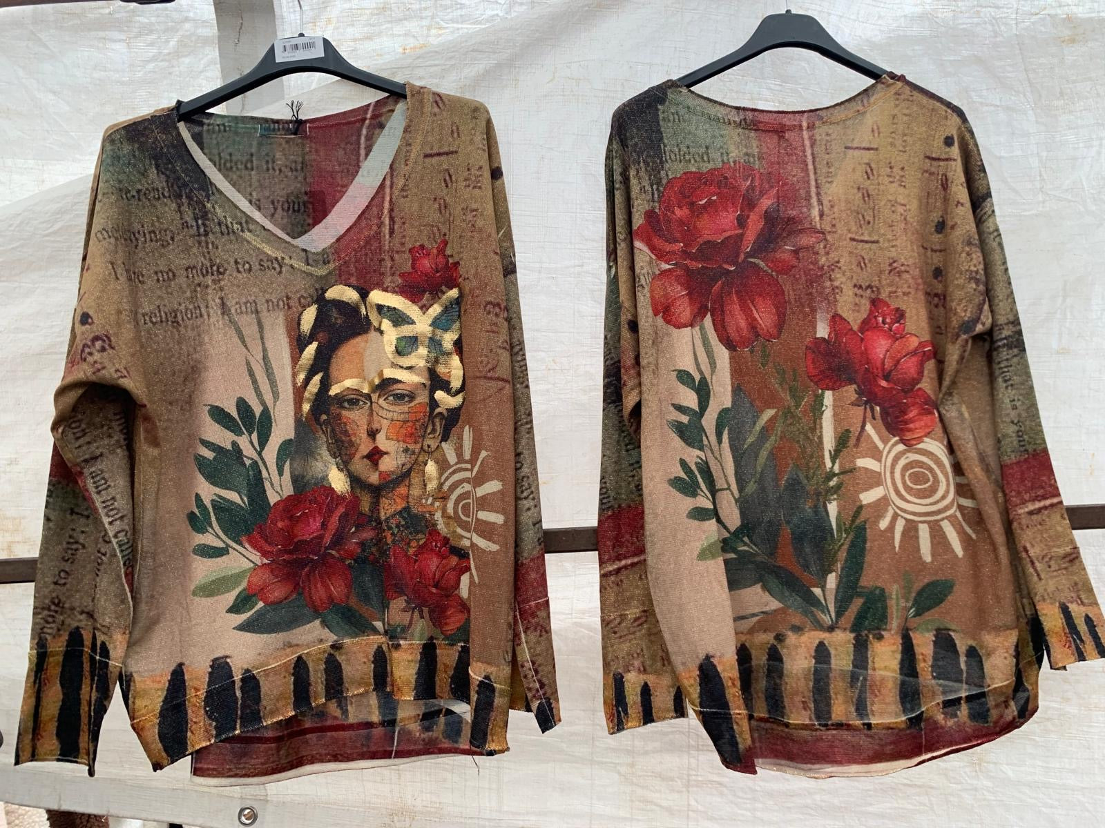 Make a statement with the Rosa Muse Shimmer Top, a striking piece featuring bold red roses and an artistic portrait print set against earthy tones. With its subtle shimmer detail, this top combines boho-chic flair with an artsy edge, perfect for standing out in style.
