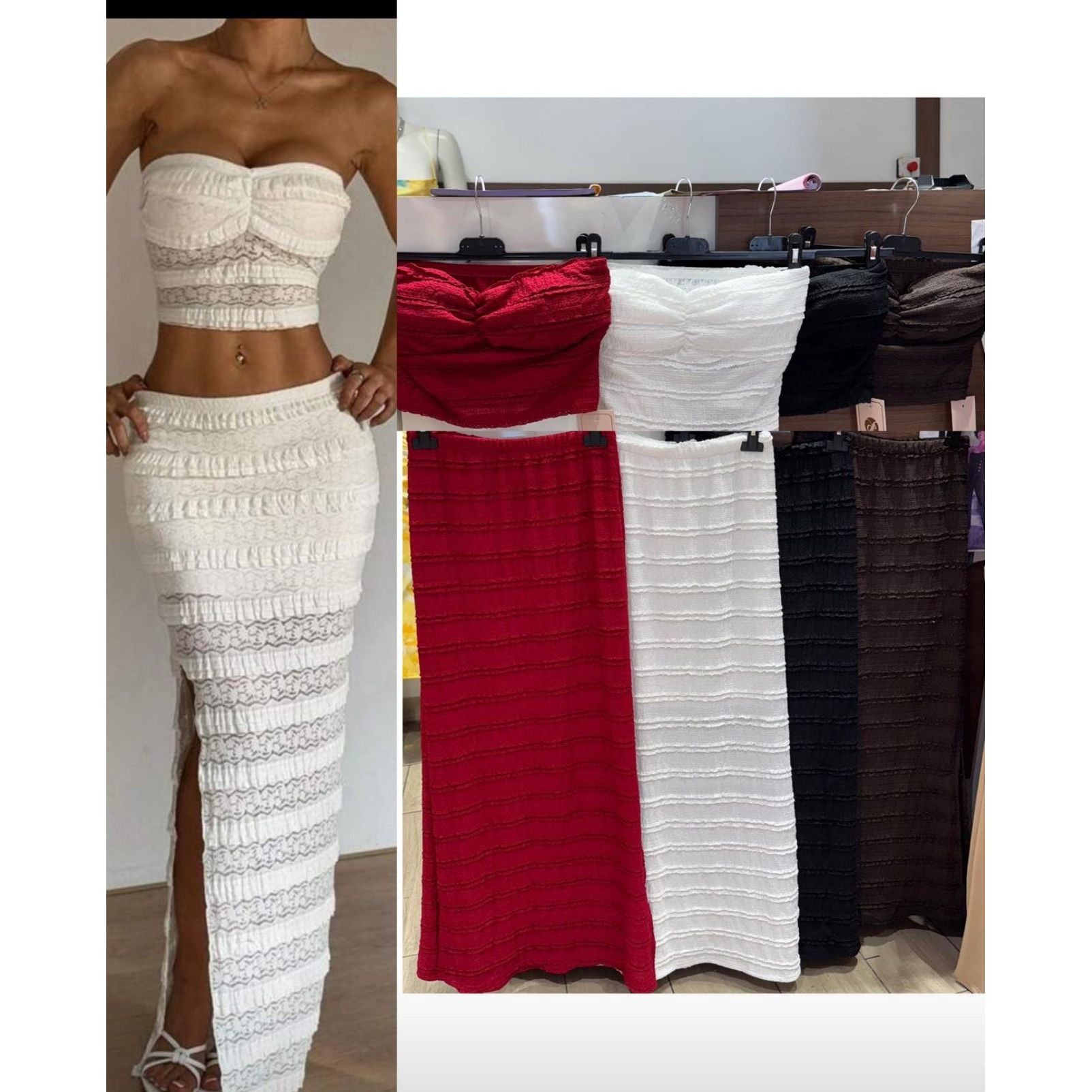 Bring the holiday vibes wherever you go with our stunning Ibiza Set. This two-piece features a ruched bandeau crop top and a matching high-waisted maxi skirt with a chic side split – perfect for cocktails, beach clubs or summer nights out.