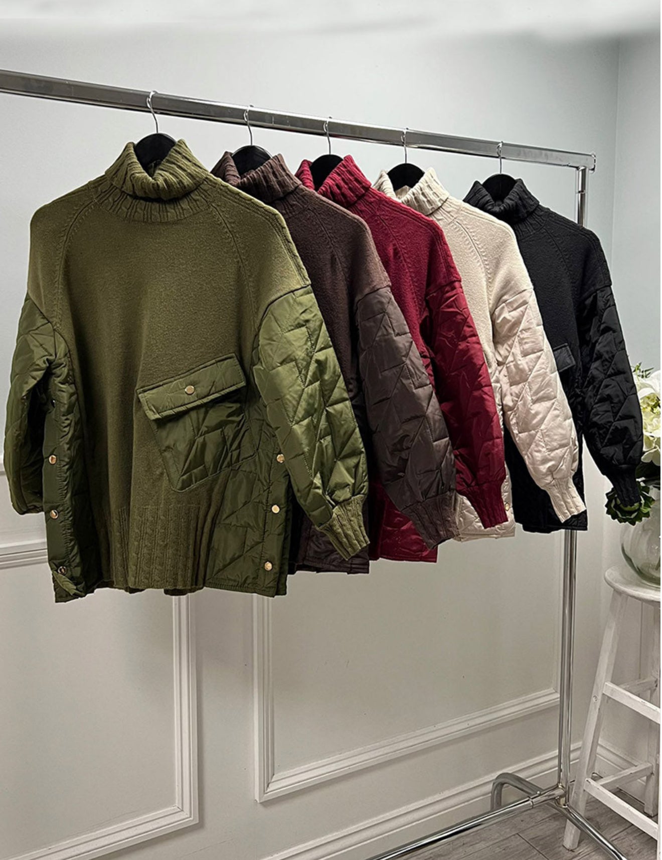 Meet The Zoe Quilted Knit — a cosy statement piece that combines knitwear comfort with quilted style. Designed with a soft knitted body, quilted sleeves, and pocket detail, it’s both warm and effortlessly chic. The high neck and gold popper accents add that touch of luxury we love.